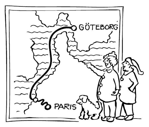 Par une belle journée d'été, nous avions préparé nos sacs à dos et pris la route pour Göteborg. Le vapeur Göta nous y attendait, et devait nous emmener au Havre. Nous avons franchi la passerelle et embarqué sur un grand navire chargé de marchandises à destination de la France. On nous a attribué une minuscule cabine où nous dormirions pendant la traversée. Soudain, le sifflet à vapeur a retenti trois longs coups, signalant la marche arrière. L'eau a écumé autour de l'hélice, le bateau a pris le large et Göteborg a disparu comme un point minuscule. Bientôt, nous étions sur le Kattegat.">Par une belle journée d'été, nous avions préparé nos sacs à dos et pris la route pour Göteborg. Le vapeur Göta nous y attendait, et devait nous emmener au Havre. Nous avons franchi la passerelle et embarqué sur un grand navire chargé de marchandises à destination de la France. On nous a attribué une minuscule cabine où nous dormirions pendant la traversée. Soudain, le sifflet à vapeur a retenti trois longs coups, signalant la marche arrière. L'eau a écumé autour de l'hélice, le bateau a pris le large et Göteborg a disparu comme un point minuscule. Bientôt, nous étions sur le Kattegat.Grand-mère demanda à Påsse : « Les Français ne parlent-ils pas bizarrement ? » « Non, répondit-il, ce n’est pas difficile du tout. Le français ressemble un peu au scanien. Dis « rullebör » et tu entendras comment ça sonne. Tu apprendras des mots importants, comme « limonade et gâteau ». Ça veut dire jus et gâteau. Comme ça, tu n’auras plus faim. Ensuite, tu inventeras des mots, et tu imiteras. Les langues, c’est super ! Les pommes de terre bouillies s’appellent « pommes vapeur », et les locomotives à vapeur s’appellent « locos vapeur », parce que les deux sentent bon. Très facile ! »