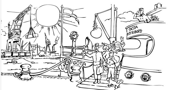 Par une belle journée d'été, nous avions préparé nos sacs à dos et pris la route pour Göteborg. Le vapeur Göta nous y attendait, et devait nous emmener au Havre. Nous avons franchi la passerelle et embarqué sur un grand navire chargé de marchandises à destination de la France. On nous a attribué une minuscule cabine où nous dormirions pendant la traversée. Soudain, le sifflet à vapeur a retenti trois longs coups, signalant la marche arrière. L'eau a écumé autour de l'hélice, le bateau a pris le large et Göteborg a disparu comme un point minuscule. Bientôt, nous étions sur le Kattegat.