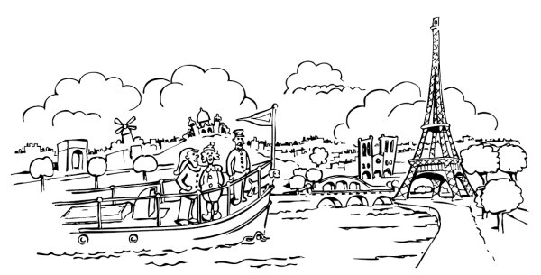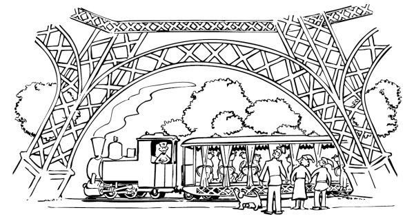 Påsse, l'ami de grand-père, voulait venir. Il connaissait quelques mots de français, ce qui était bien pratique. Grand-père et Påsse étaient devenus amis à la maternelle du Père Noël et jouaient tout le temps ensemble. Ce qu'ils préféraient, c'était construire des trains. Ils les fabriquaient avec des chaises, des coussins, des bâtons, des planches et de vieilles boîtes de conserve. Parfois, ils construisaient des trains Brio. Et puis, ils faisaient semblant d'être des stins et des conducteurs de train. Ils aimaient aussi dessiner et peindre. Presque tous les jours, ils dessinaient des trains, des tunnels et des gares. Påsse savait dessiner de très grandes et belles maisons en briques. Presque comme des châteaux ! « Tu dois dessiner quelque chose tous les jours », pensa-t-il. « Au moins une petite locomotive ! » « Mais maintenant, raconte-moi comment c'était quand tu es allé à Paris ! » « Oui, la grande fête d'été s'appelait l'Exposition universelle. » « Alors, tu dois dessiner quelque chose de vraiment étrange que tout le monde veut voir. » Ilsont donc eu l'idée de construire une haute tour. On l'a appelée « la Tour Eiffel » parce que le vieil homme qui l'a construite s'appelait Gustave Eiffel. On « peut monter les escaliers de la tour et, quand on regarde du haut, on a l'impression de flotter dans une montgolfière.