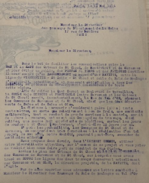 Saint-Cloud écrit au Directeur de tramways du Bois de Boulogne au Val-d'Or, 75