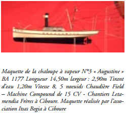 Maquette de la chaloupe à vapeur N°3 « Augustine » BA 1177 Longueur 14,50m largeur : 2,90m Tirant d’eau 1,20m Vitesse 8, 5