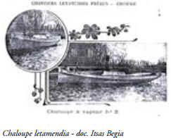 9m2 destinée au bateau le Saint Raymond qui porte la référence N° 50 dans le catalogue Letamendia. Ce type de chaudière est prévu pour entraîner une machine de 12 CV à deux cylindres pleine pression. Les chantiers Letamendia proposent ce type d’équipement pour ses chaloupes N°2 : Longueur 14m - Largeur 2,80m - Tirant d’eau 1,10m – Vitesse 8 nœuds. Charpente et membrures en chêne bordage à franc-bord en pitchpin - rivetage cuivre – cloison de soutes en tôle galvanisée – réservoir d’eau de 1000 litres – Contenance des soutes à charbon 2 tonnesChaloupe letamendia - doc. Itsas