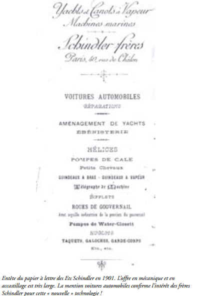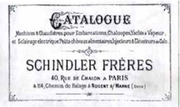 En 1882 les quatre frères Schindler s’installent 40 rue de Châlon à Paris, sous la direction le l’aîné, Georges. Les ateliers abritent quatre spécialités, les constructions de chaudières, de machines à vapeur, d’embarcations, et un atelier d’ébénisterie qui disparaîtra petit à petit au profit de la construction