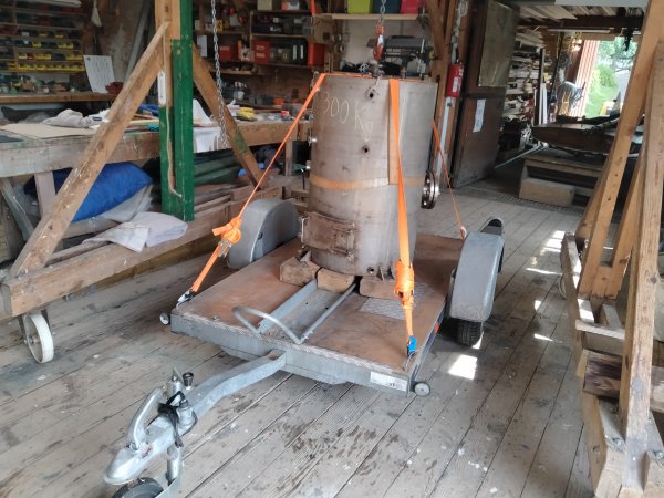 Nous avons décidé par précaution de déposer la chaudière, une belle journée de travail pour les personnes présentes que nous remercions. Après avoir déplacé l'établi, reculé Roastbeef et rangé d'autres matériels encombrant, nous avons donc rentré Vigie sous la chèvre, soulevé la chaudière, sorti le bateau et reposé la chaudière sur un chariot.