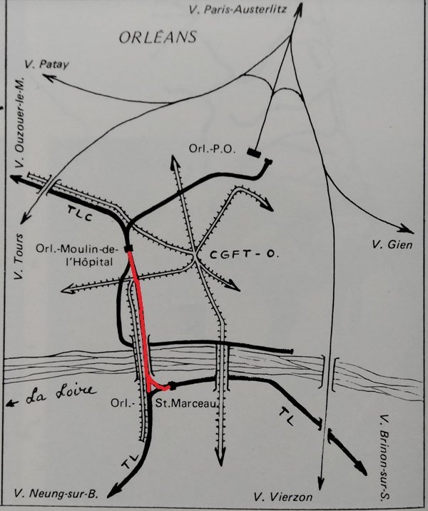 L'importance des jonctions entre réseaux et entre lignes était au cœur même d'Orléans. ll a fallu attendre 1907 pour voir se réaliser celle des gares Moulin-de-l'Hôpital au Nord de la Loire avec Saint-Marceau sur la rive gauche. Ce raccordement de seulement 1,140 mètres mettait en relation deux ensembles de lignes réunissant les réseaux Nord et Sud du Loiret et mettant ainsi en relation les Départements de l'Eure-et-Loir, du Cher et du Loir-et-Cher.