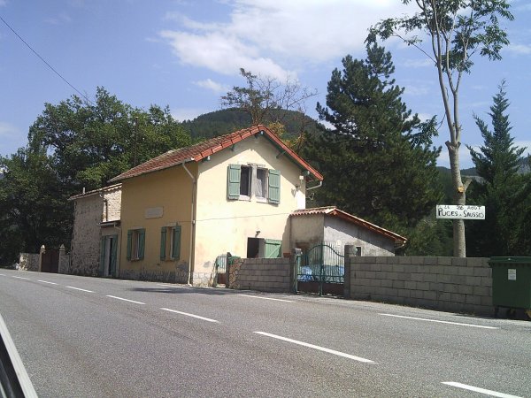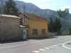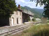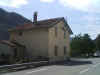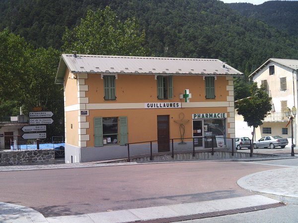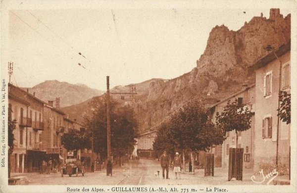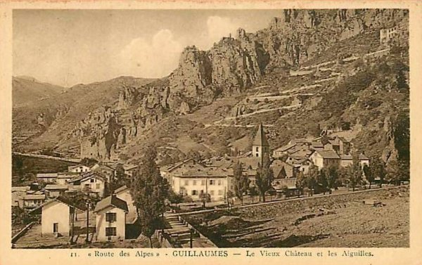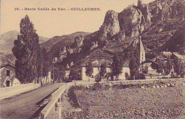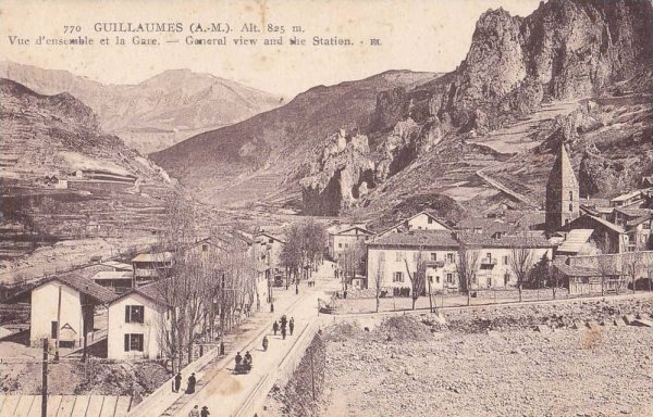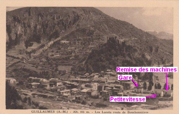 l'entrée de Guillaumes. À gauche les bâtiments de la gare.