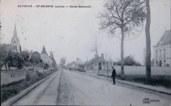La Grande rue et la poste. Vue en direction d'Orléans. À la sortie du village, la voie