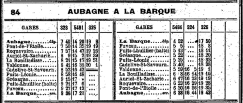 1936 il y avait trois trains quotidiens d'Aubagne à La Barque plus un partiel
