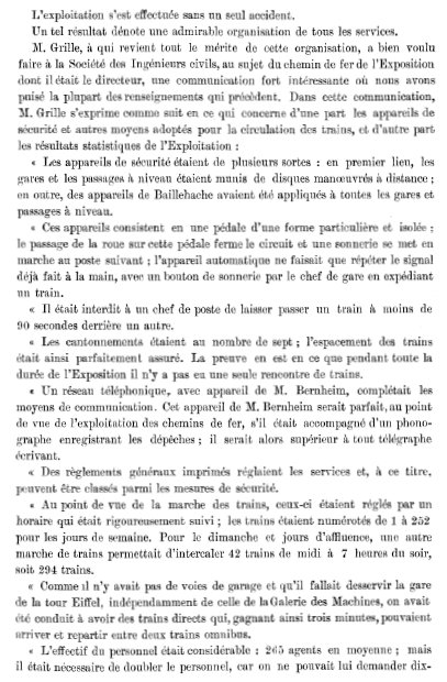 Comme il n'y avait pas de voies de garage et qu'il fallait desservir la gare de la Tour Eiffel, indépendamment de la Galerie des Machines, on avait été conduits à avoir des trains directs qui gagnant ainsi trois minutes, pouvaient arriver et repartir entre deux trains omnibus.