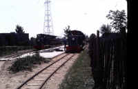 l'autre attendait à la station. Le bâtiment destiné à la billetterie était à droite, non visible sur le cliché. Noter sur les tôles arrières des baladeuses, le filet blanc qui relève l'esthétique. Il a disparu au fil du temps. C'est dommage ! |