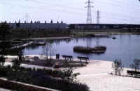 scène, vue en direction Passage de Verdure. On remarque sur le quai les housses qui abritaient les locotracteurs Socofer lorsqu'ils ne circulaient pas. Les deux trains étaient alors stationnés à Pompidou emmaillotés dans leur housse toute la semaine sans qu'aucune dégradation ne fut observée. Les barrières provisoires ont été par la suite remplacées par du grillage. Au fond le pylône haute tension pour une ligne de délestage (300 000 volts). C'était au temps de la centrale électrique de Gennevilliers. |