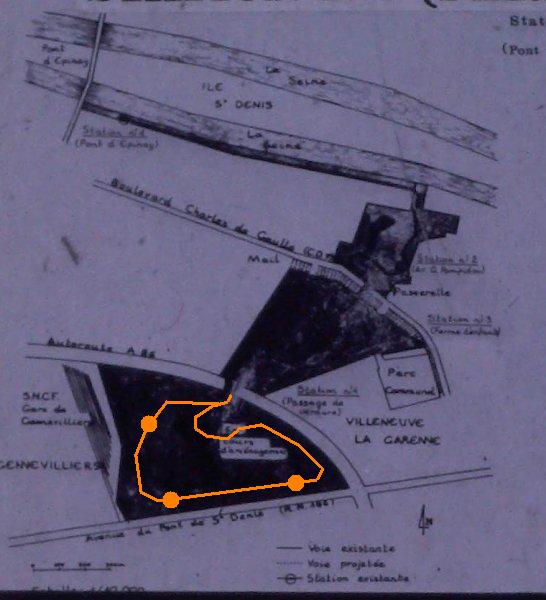 Détail du plan du réseau. On peut noter le tracé en pointillé tel qu'il avait été prévu dans l'étude de Jean-Yves Guillemont (CF de St Eutrope - 91). Après Passage de Verdure, le tracé faisait une boucle complète de la 4ème Tranche (aujourd'hui Les Tilliers. Trois stations avaient été prévues Petit Lac (L'Étang), Gennevilliers RER et une station desservant le théâtre de Verdure. En fait, au moment de la réalisation de l'extension en 1991, seule la partie Petit Lac, Gennevilliers RER a été construite et l'équipe de l'époque a demandé de faire le tour du Belvédère afin d'avoir une raquette de retournement pour le matériel roulant. Cela dit, la plate-forme avait été créée en partie laissant un espoir de réalisation future. Voir aussi :
