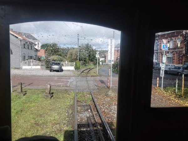 Revenons devant le musée. La motrice 34 du TVL est de retour de Lobbes, sous la pluie.