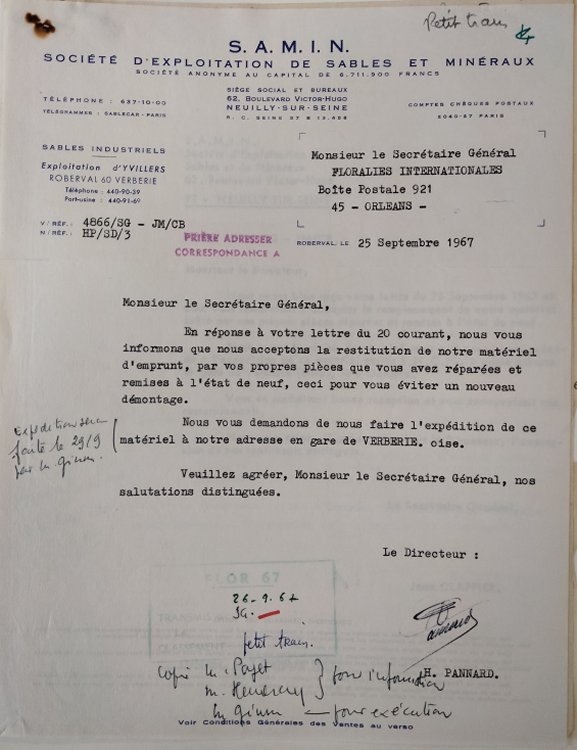 Le 10 août 1967, M. Pannard, Directeur carrière de Roberval écrit qu'il est heureux d'avoir pu dépanner l'AFO avec les pièces gracieusement prêtées. En revanche il est dans l'impossibilité de commander le flector et le ressort de suspension et conseille de s'adresser à l'Entreprise Patry, 23 rue de la Boétie à Paris 8ème.
