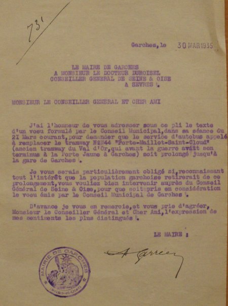 7 mars 1935, le maire de Garches demande à un conseiller municipal de Paris