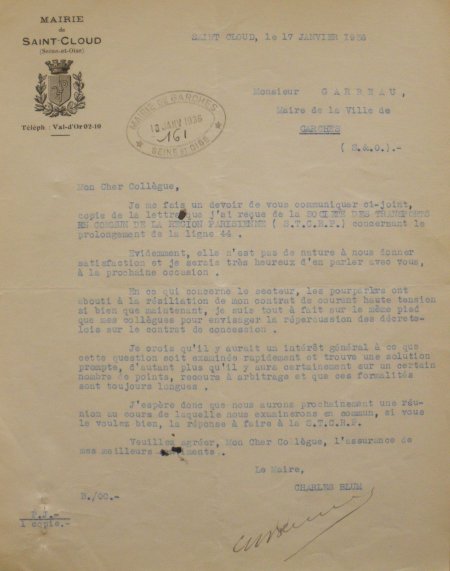 22 janvier 1936 le maire de Garches répond à son collègue de St Cloud qu'il
