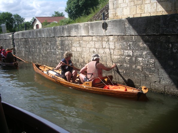le passage. Avec Jean-Claude nous faisons une giration complète en marche arrière, histoire de peaufiner la manœuvrabilité de Suzanne. Bien sûr le rayon est plus généreux mais un cercle bien régulier vient de s'inscrire sur le plan d'eau face à l'entrée du tunnel. |