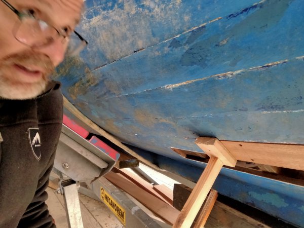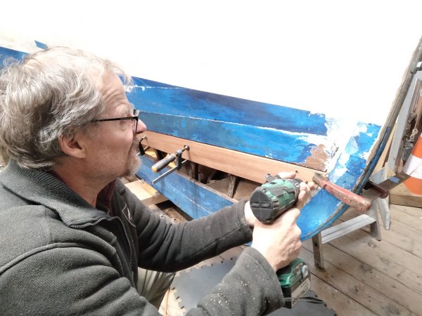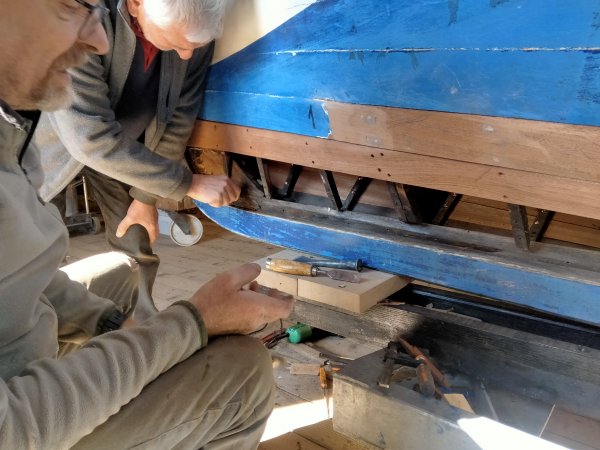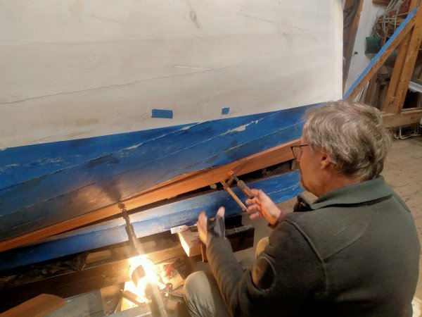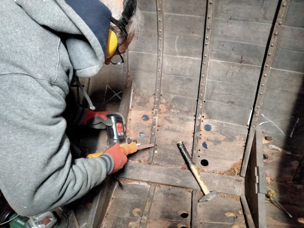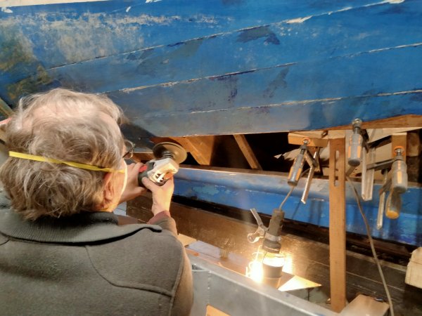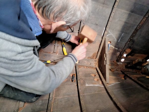 Pierre coupe les têtes de rivet en cuivre pour désolidariser la virure ou le