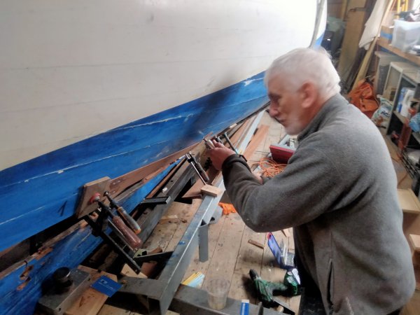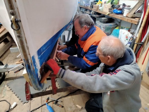 Marcus et Yves ont posé et fixé définitivement le dernier bordé bâbord. Marcus a poncé l'ensemble des nouveaux bordés sur l'étrave.