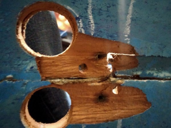 Puis il découpe un morceau de bordé légèrement pourri de l'intérieur.