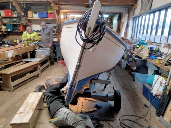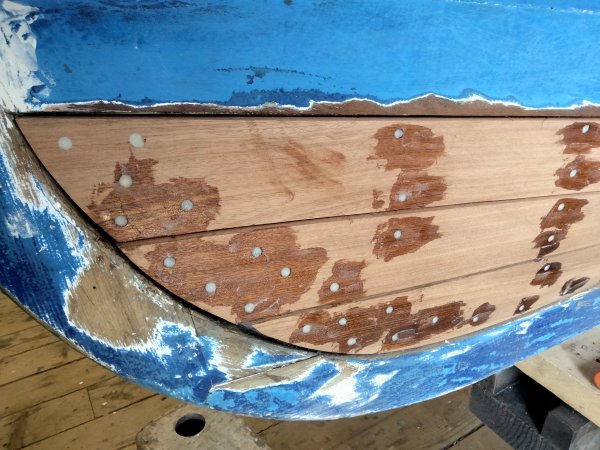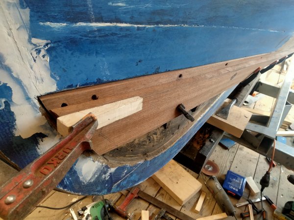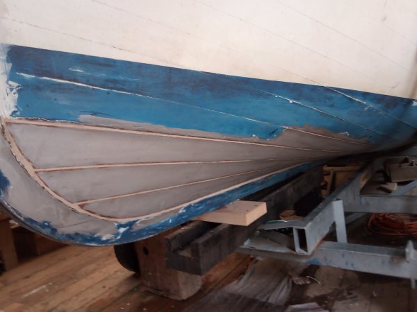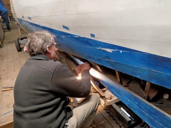 Marcus : ponçage extérieur et intérieur des bordés, époxy sur les trous de vis