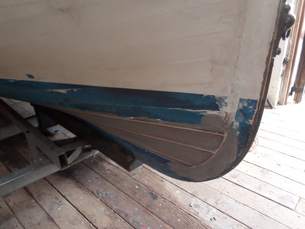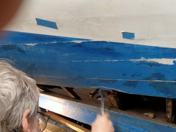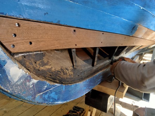Contrairement à ce que l'on pouvait penser, on ne passe pas au bordé suivant mais directement au galbord, c'est à dire celui contigu à la quille. Donc opération de démontage du galbord à remplacer : scie sauteuse, marteau, ciseau à bois puis grattoir meuleuse pour avoir une portée propre sur la quille.