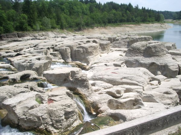 L'arrivée sur Pont de Poitte point final de notre randonnée. Un paysage inhabituel formé de roches que la baisse de niveau d'eau nous laisse découvrir. Un ancien barrage produisait du courant puis il a été abandonné lors de la construction du barrage de Vouglans.