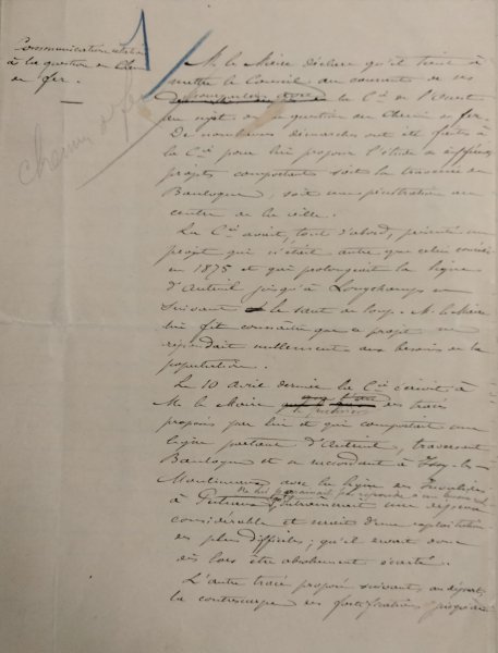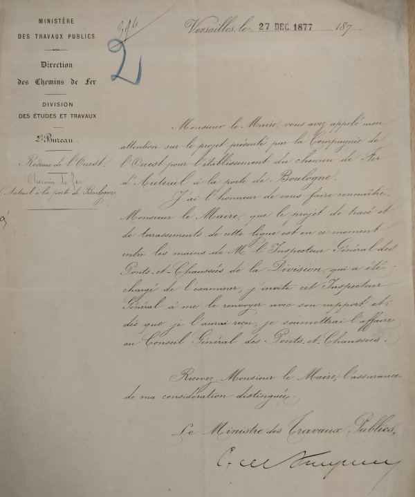 Le 27 décembre 1877, Le Ministre des Travaux publics écrit au Maire de
