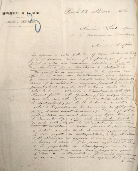Le 22 mars 1883, Le Conseiller général du Département écrit au Maire de