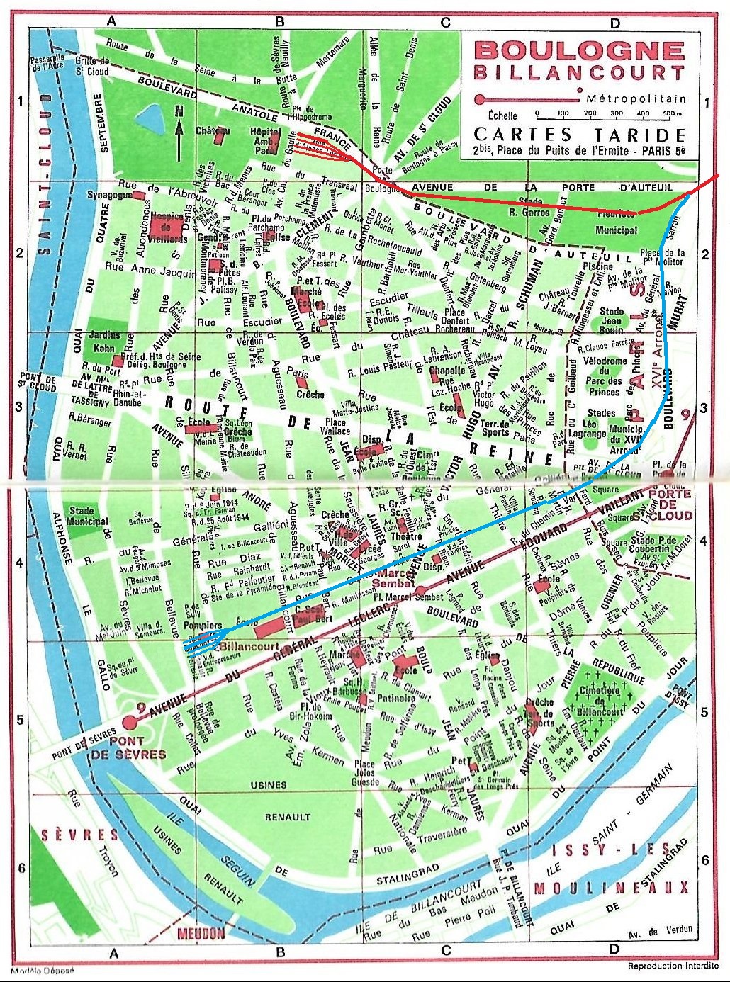 Boulogne-sur-Seine, en bleu la gare du Pont-de-Sèvres. les deux tracés se