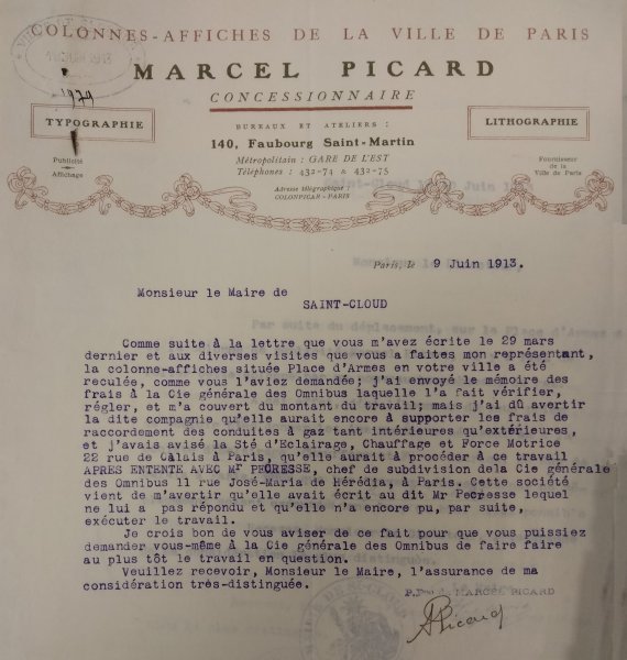 Le 24 juin 1913, le Maire de Saint-Cloud écrit au Directeur de la Compagnie générale