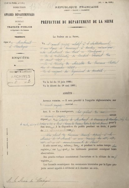 Article 2. en conséquence les pièces de cet avant-projet seront déposées aux Mairies de Montreuil-sous-Bois de Vincennes, de Boulogne, chef lieu de Neuilly, ainsi qu'à la Ville de Paris bureau des Travaux publics pour y être tenues à la disposition du public pendant la durée d'un mois, à partir du 14 février 1897.