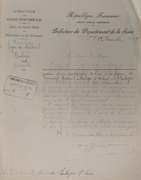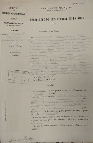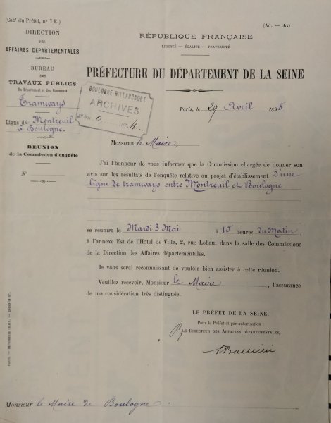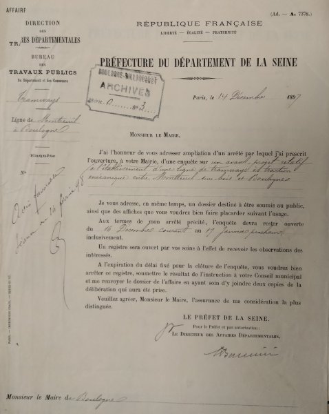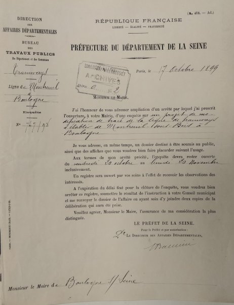 Le Préfet de la Seine écrit au Maire de Boulogne. L'enquête ouverte à votre