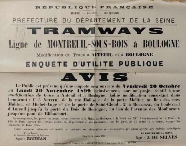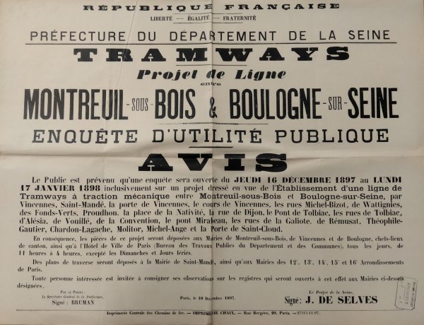 affiche de la Préfecture du Département de la Seine au sujet de l'enquête