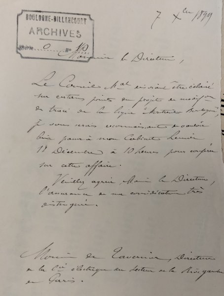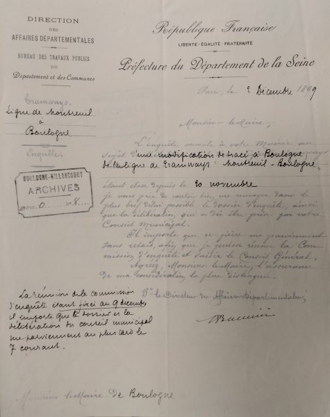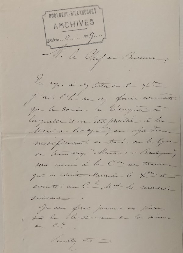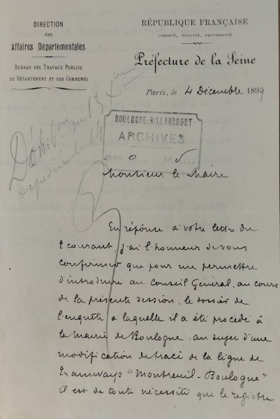 Le 7 Xbre 1899, le Maire de Boulogne-sur-Seine écrit au directeur de