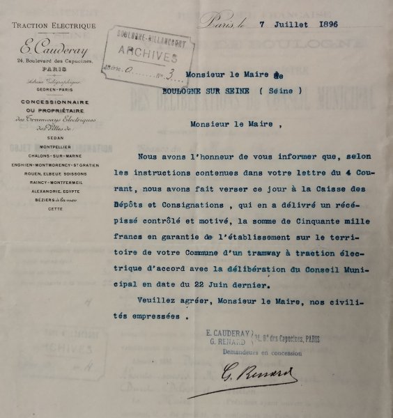 Monsieur Cauderay concessionnaire de tramways écrit au Maire de