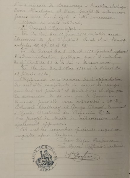 de tramways à traction électrique dans Boulogne et d'un projet de rétrocession