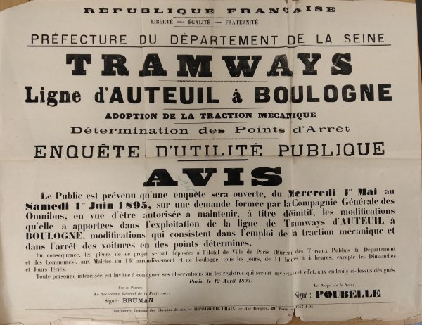 Le 13 avril 1895, affiche de l'enquête d'utilité publique concernant le projet