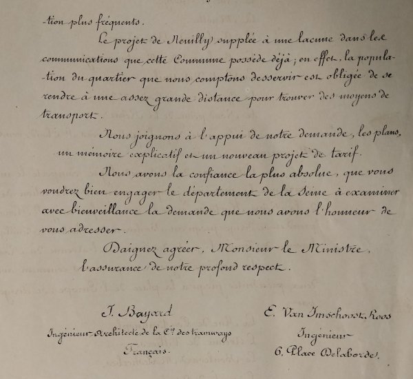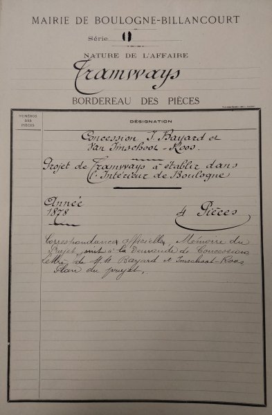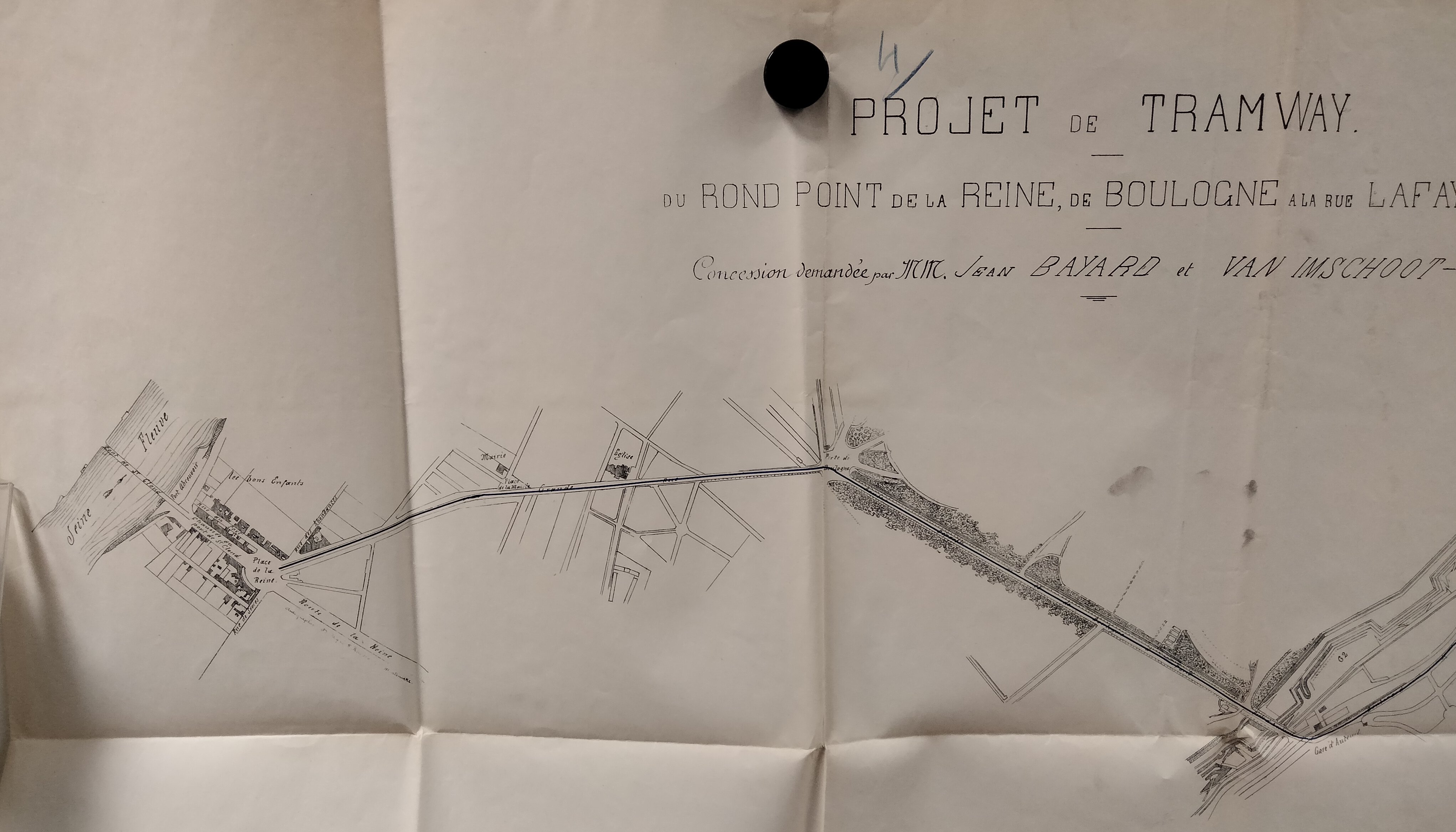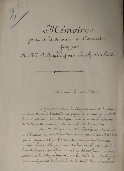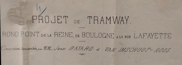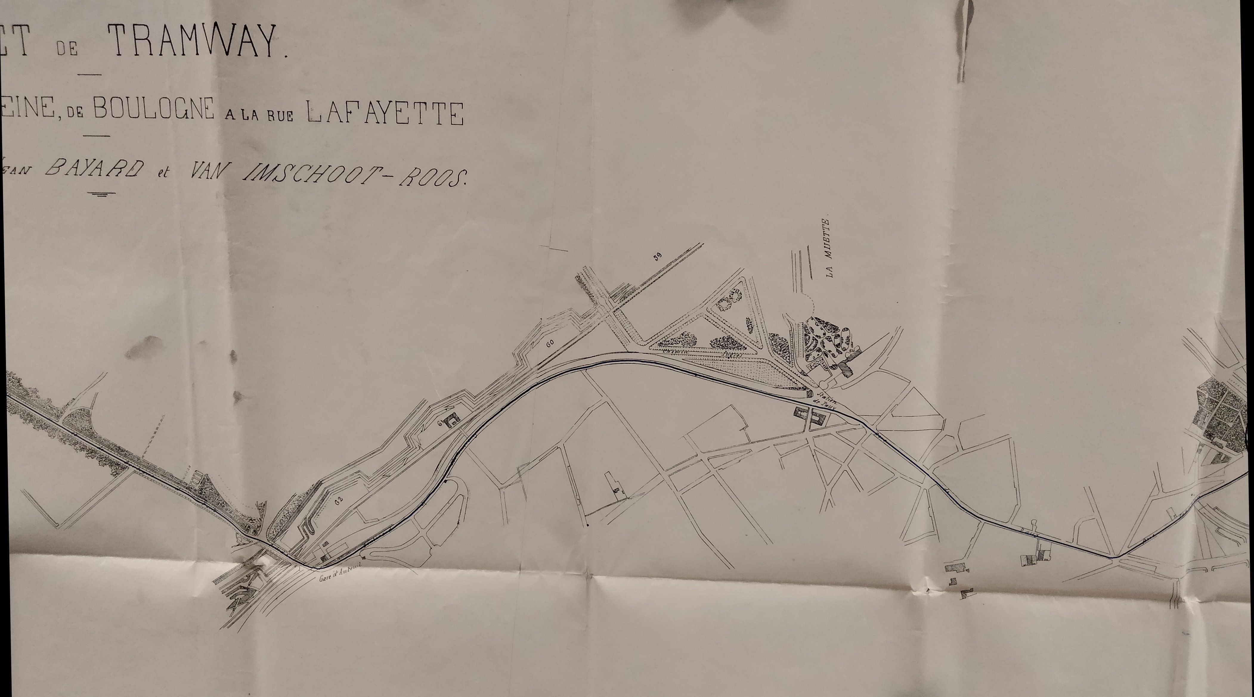 | En 1878, MM. J. Bayard et Van Jinschoot-Roos proposent une concession pour une ligne reliant le centre de Paris (rue Lafayette) au Rond-Point de Boulogne, à Boulogne-sur-Seine, en desservant plusieurs secteurs : Saint-Lazare, Parc Monceau, les Ternes, l’Étoile, Passy, Auteuil, puis Boulogne-sur-Seine. À cette époque, on note déjà des progrès dans la conception des voitures, qui deviennent plus légères, ce qui rend les projets de transport urbain et suburbain plus réalistes. En février 1878, survient un malentendu : M. Van Jinschoot-Roos