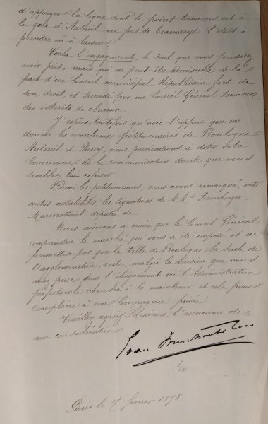 Le 8 avril 1878, M. le Maire de Boulogne écrit au Ministre des Travaux publics pour solliciter de sa
