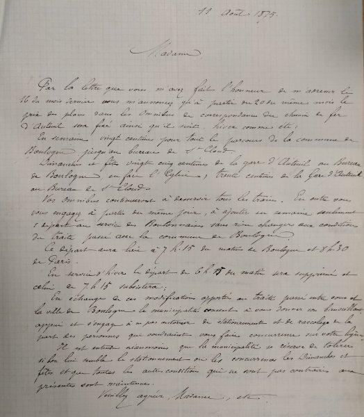 apparaît entre Boulogne et Paris Les Boulonnaises. Mais dès 7bre 1875, un premier malentendu entre les parties apparaît au sujet d'un montant tarifaire sur le parcours de Saint-Cloud les dimanches et fêtes qui excède de 5 centimes ce qui avait été convenu. En octobre 1875, un second différent survient au sujet d'une perception de tarif excédentaire dont le Maire lui-même en a été témoin. Cet incident sera sanctionné par le Conseil municipal qui imputera la somme indue au montant de la subvention. En juin 1876 le Conseil municipal de Boulogne prend la décision