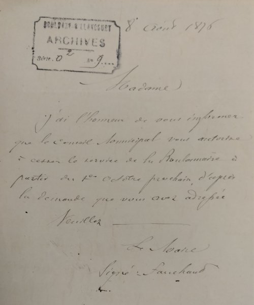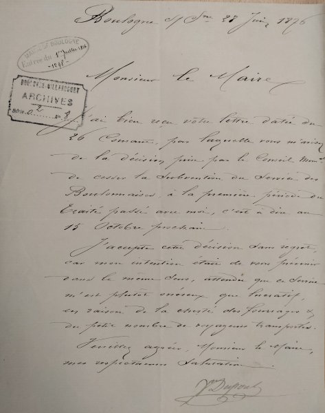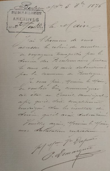 Le 8 août 1876, Le Maire de Boulogne écrit à Mm Vve Dupont.