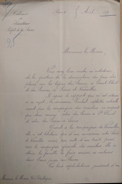 Le 3 juillet 1882, le Maire de Boulogne écrit au Préfet de la Seine.