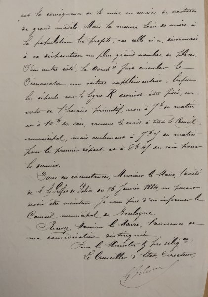 Le 13 mai 1885, Le Conseiller d'État écrit au Maire de Boulogne.