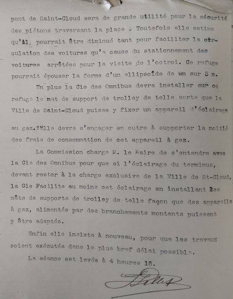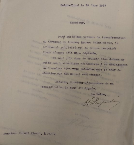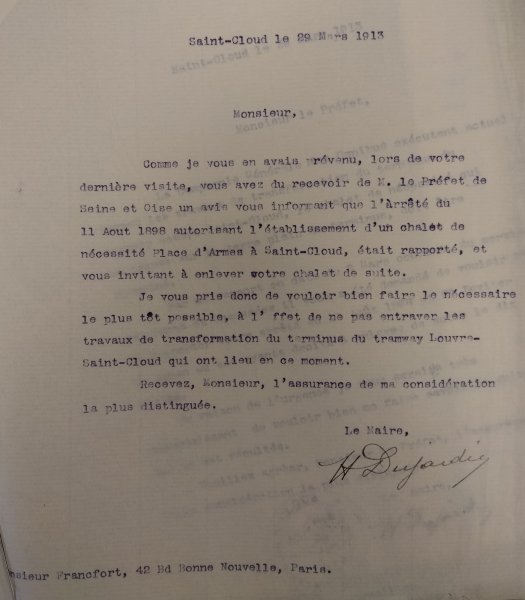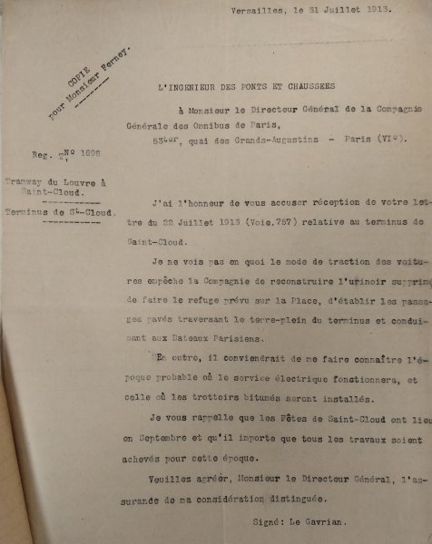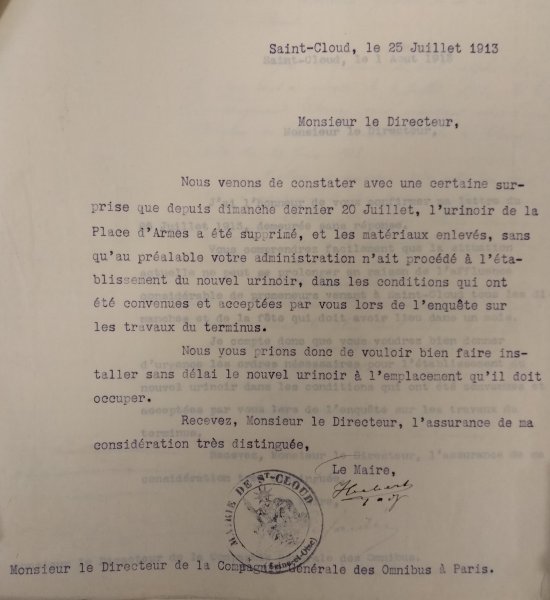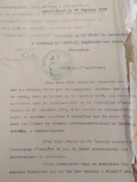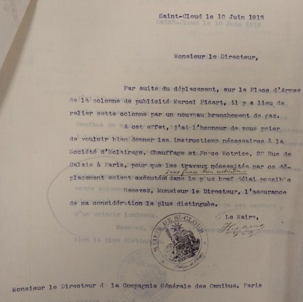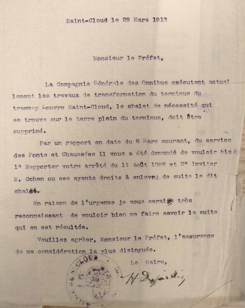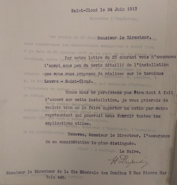 Le 24 juin 1913, le Maire de Saint-Cloud écrit au Directeur de la Compagnie générale