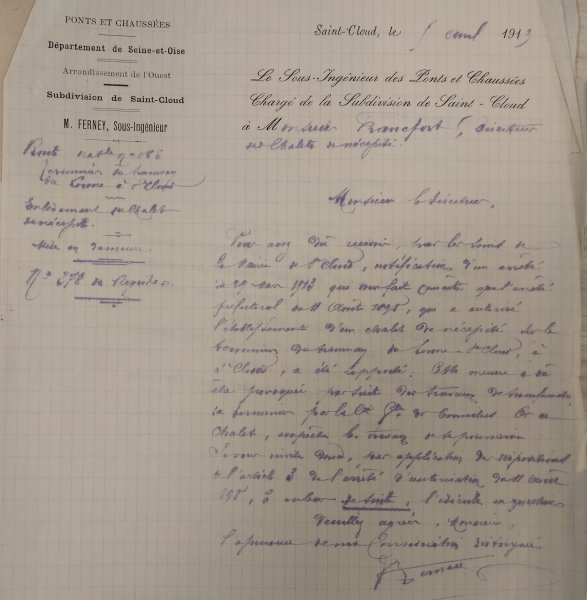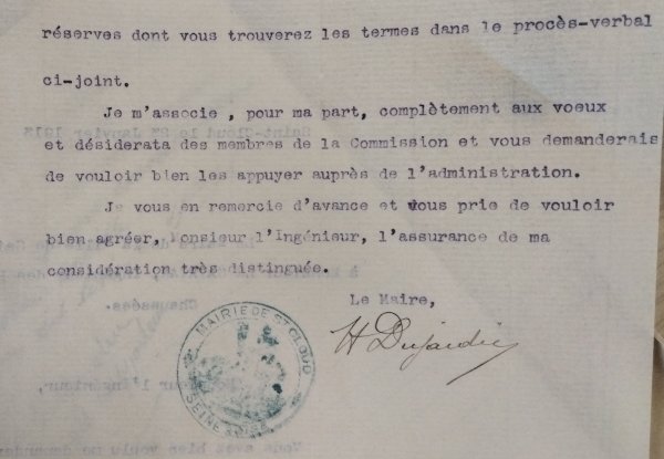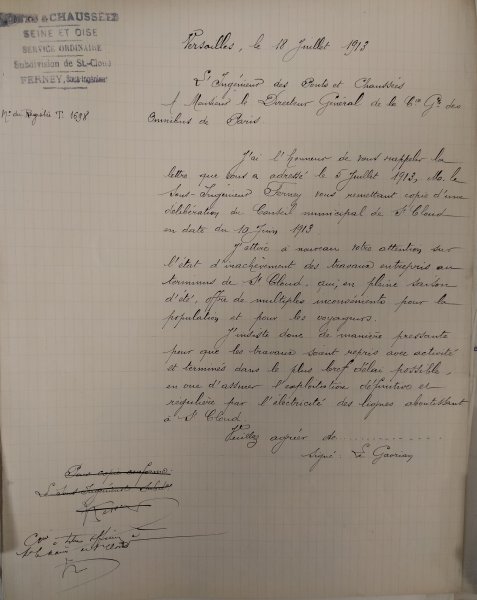 Le 31 juillet 1913, L'ingénieur des Ponts-&-Chaussées écrit au Maire de Saint-Cloud