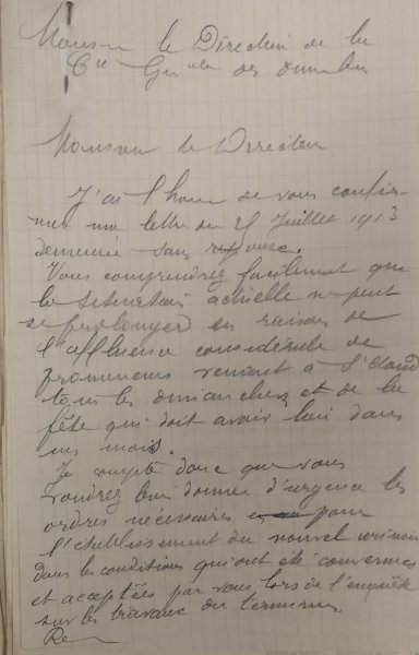 Le 25 juillet 1913, Le Directeur de la Compagnie générale de Omnibus écrit au Maire de