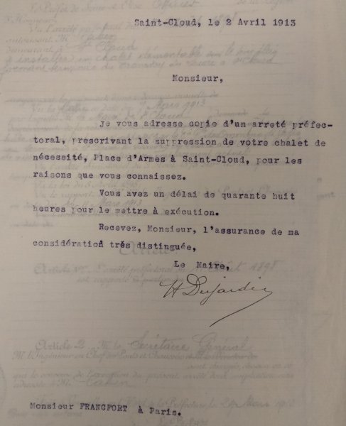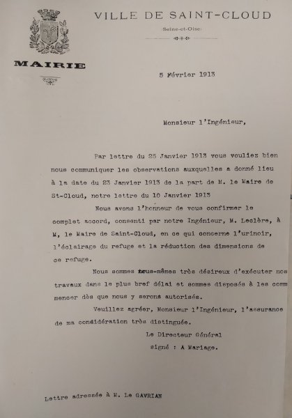 Le 5 février 1913, le Maire de Saint-Cloud écrit à M. l'ingénieur de la Compagnie