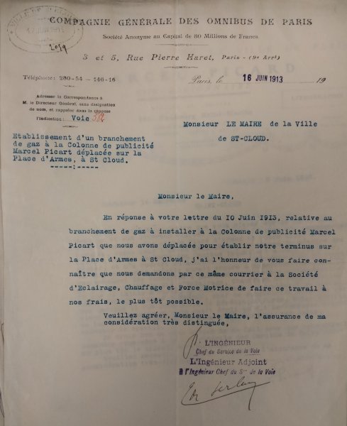 Le 19 juin 1913, le Directeur de la Compagnie générale des Omnibus, écrit au Maire de