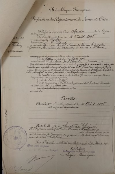 Le 29 mars 1913, Le Préfet de Seine-et-Oise, Officier de la Légion d'Honneur, vu